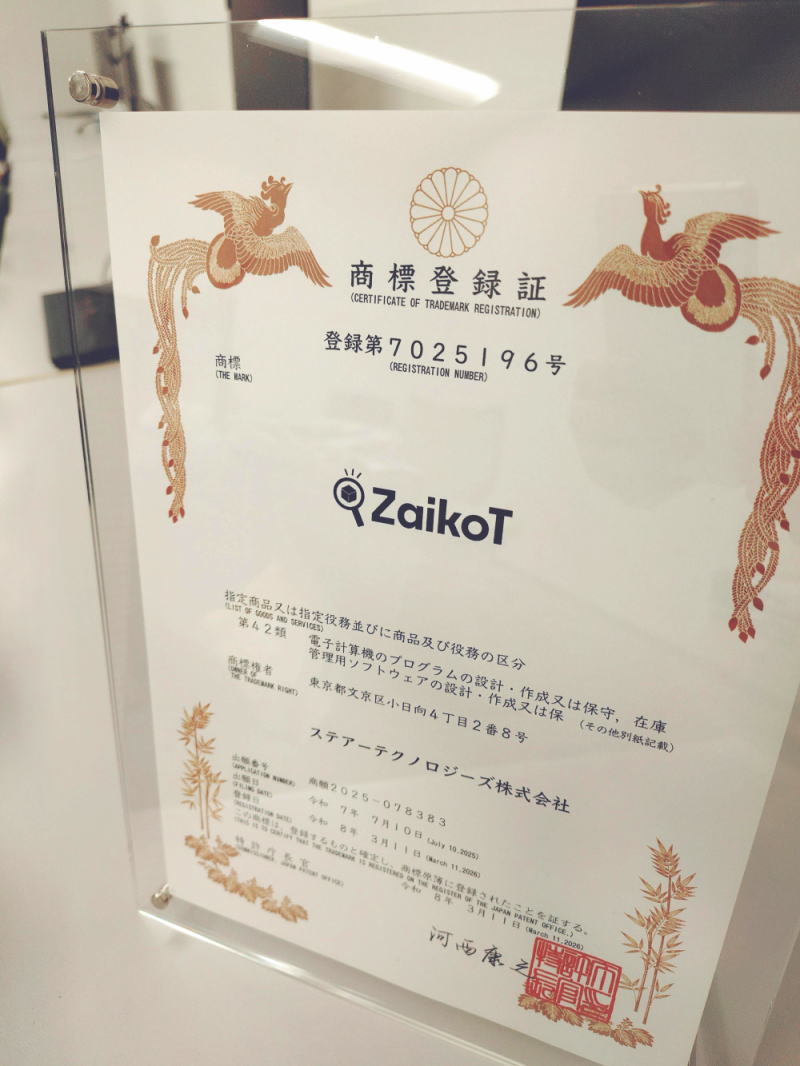 商標: Zaikot商標権者: ステアーテクノロジーズ株式会社登録番号: 第7025196号登録日: 令和8年3月11日